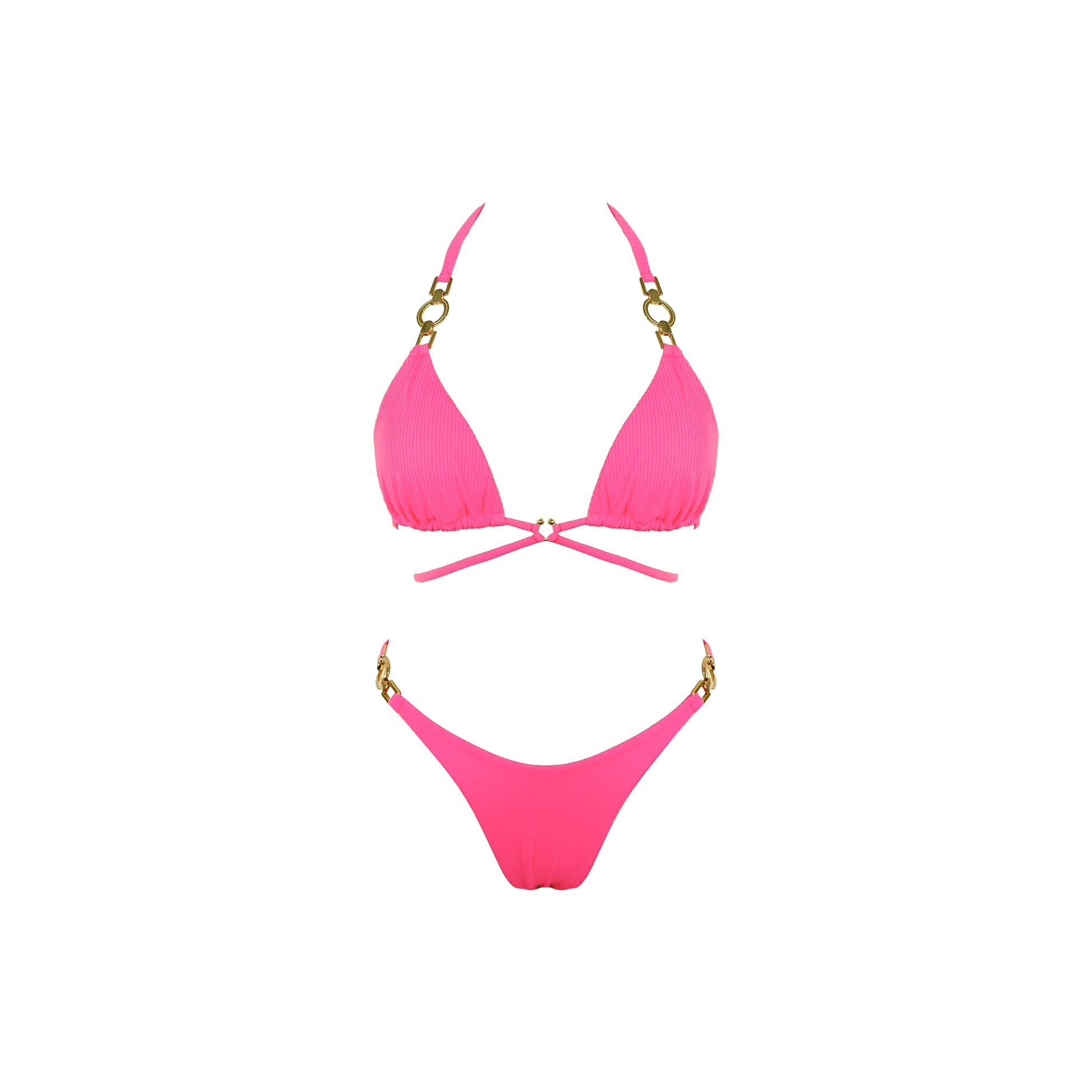 The Sundaze Brunch Serena Bikini Set brings timeless appeal in a vibrant hot pink hue. Crafted from a premium ribbed fabric blend, this two-piece delivers both comfort and durability. The set features elegant gold metallic accents on the top and bottom, while adjustable tie-back and tie-neck straps ensure a customizable fit. Delicate strappy detailing adds visual interest, and full lining provides coverage and confidence. Perfect for poolside lounging or beach days, this versatile set combines classic style with contemporary flair.
